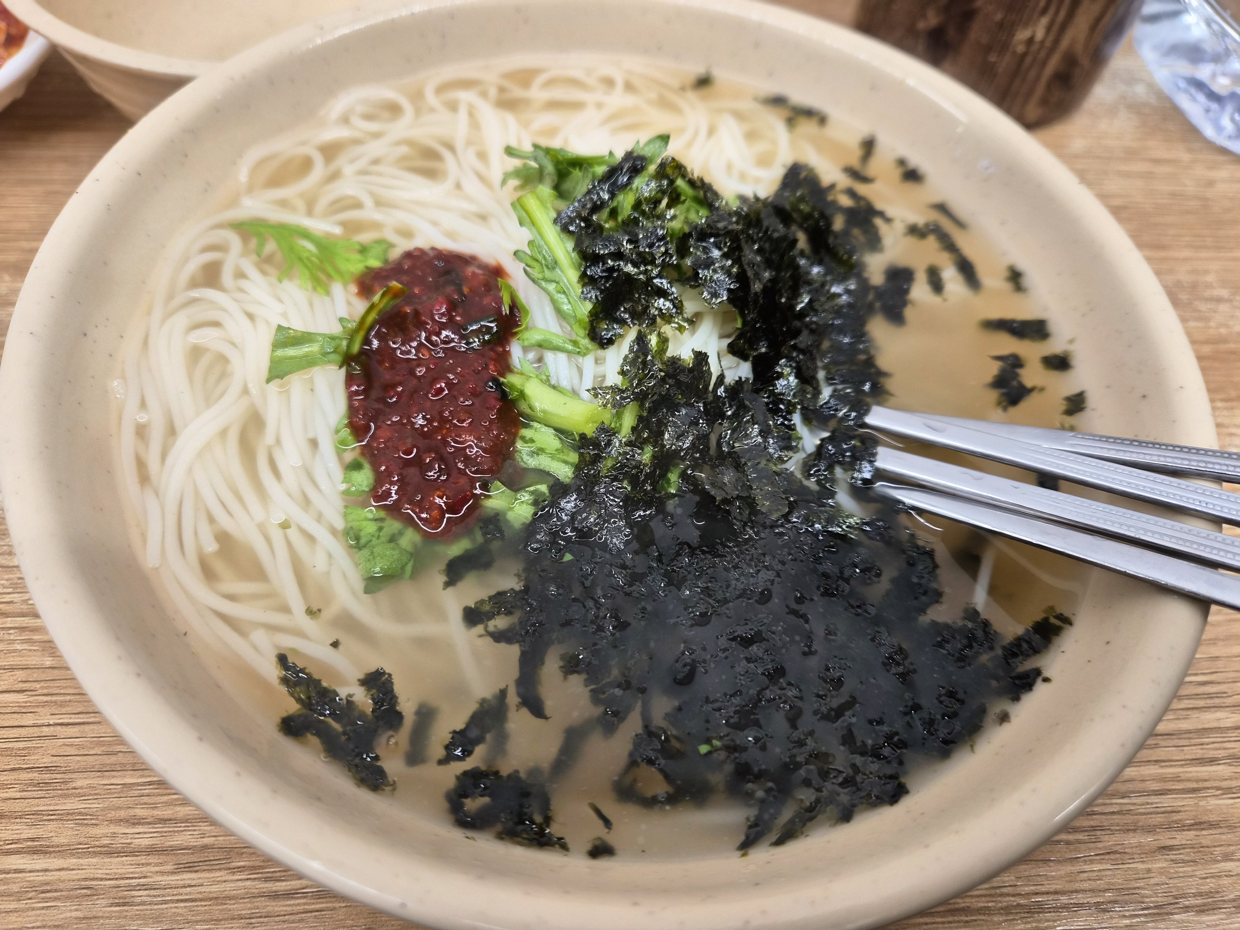 잔치국수는 육수가 상당히 진했습니다. 다대기를 풀어 먹으니 칼칼함이 더해져 깊은 맛이 살아났습니다. 김 고명이 얹혀 감칠맛을 더해주었고, 전체적으로 담백하지만 밋밋하지 않은 한 그릇이었습니다. 양도 넉넉해 든든했습니다. 김과 같이 올려진 쑥갓도 향긋하니 입맛을 돋웠습니다.