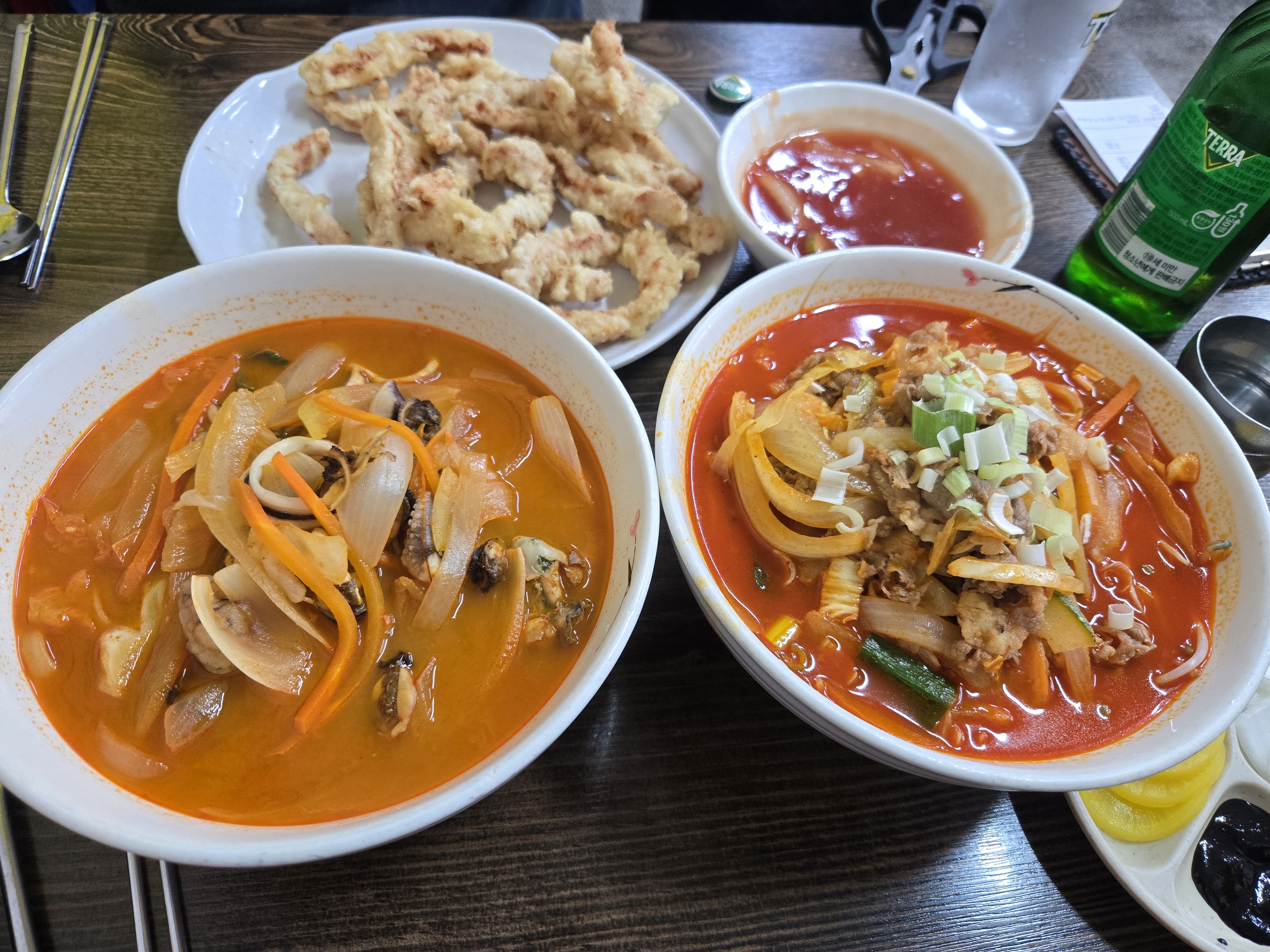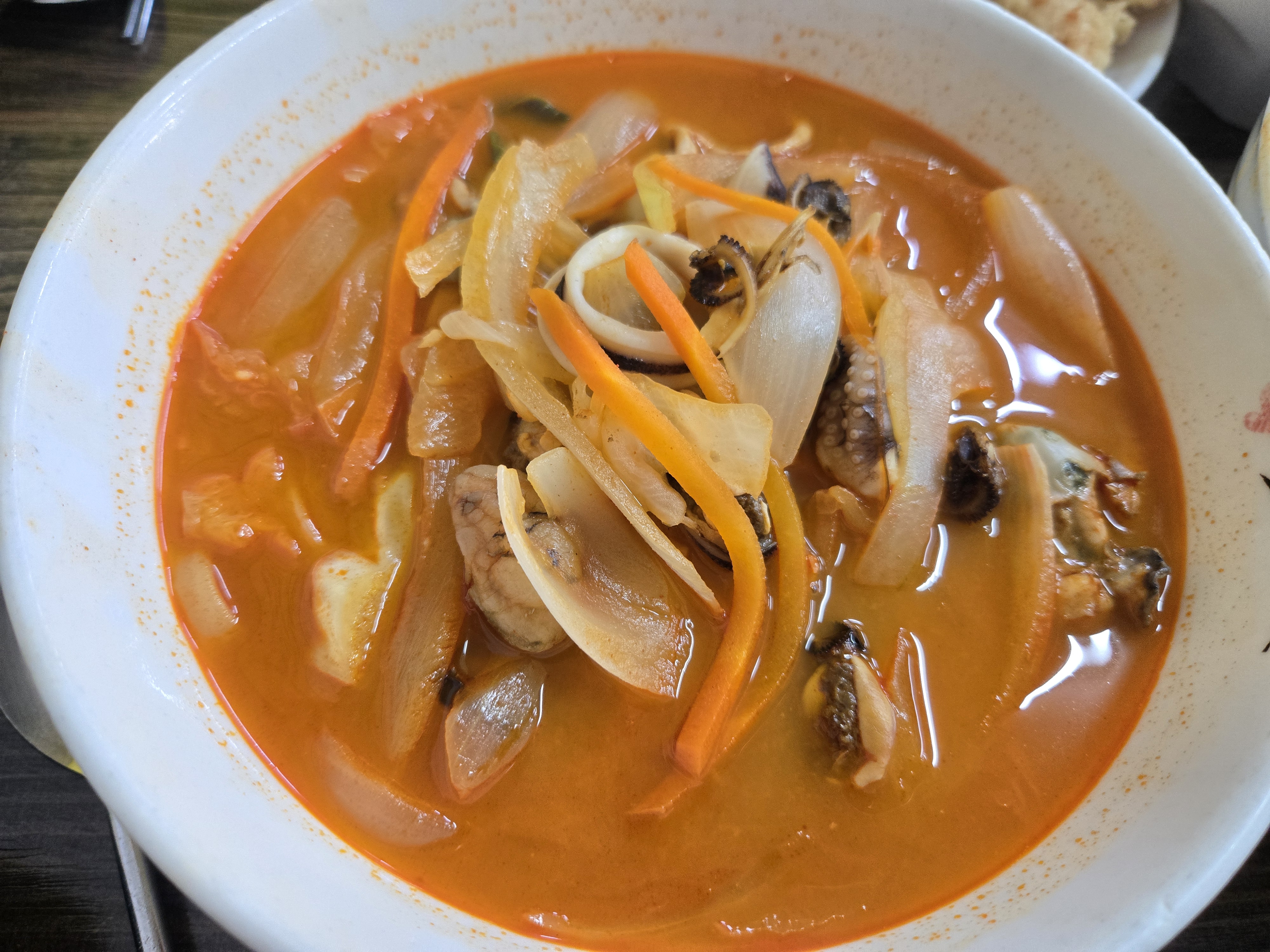 굴, 홍합, 오징어, 쭈꾸미, 새우, 미더덕 등 다양한 해물이 들어있습니다. 특히 껍질을 제거한 해물이 많아 먹기 편했습니다. 국물은 얼큰하고 칼칼하며, 고기짬뽕보다 조금 더 매콤합니다. 진한 해물 맛이 인상적이었어요.
