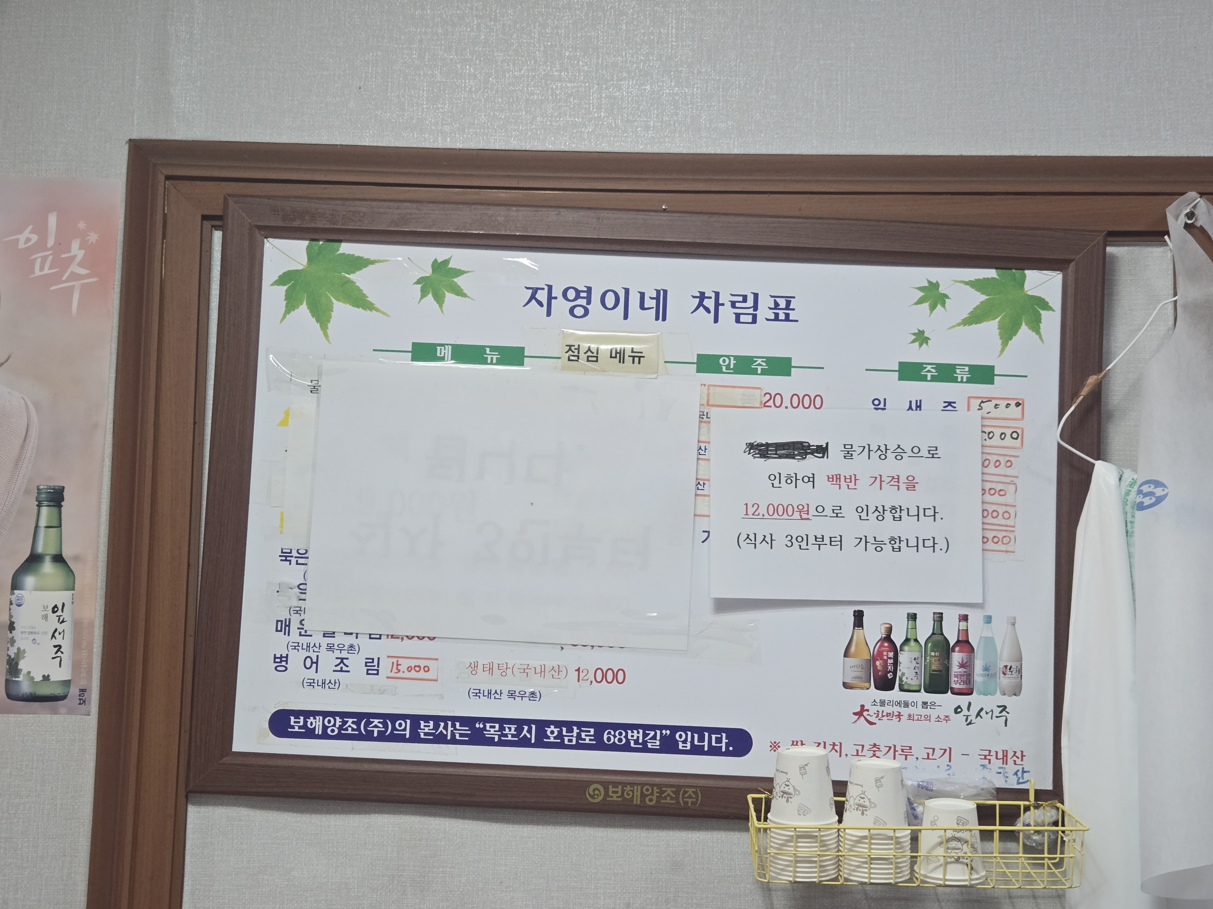 자영이네는 백반집이고, 식사는 3인 이상부터 가능해요.