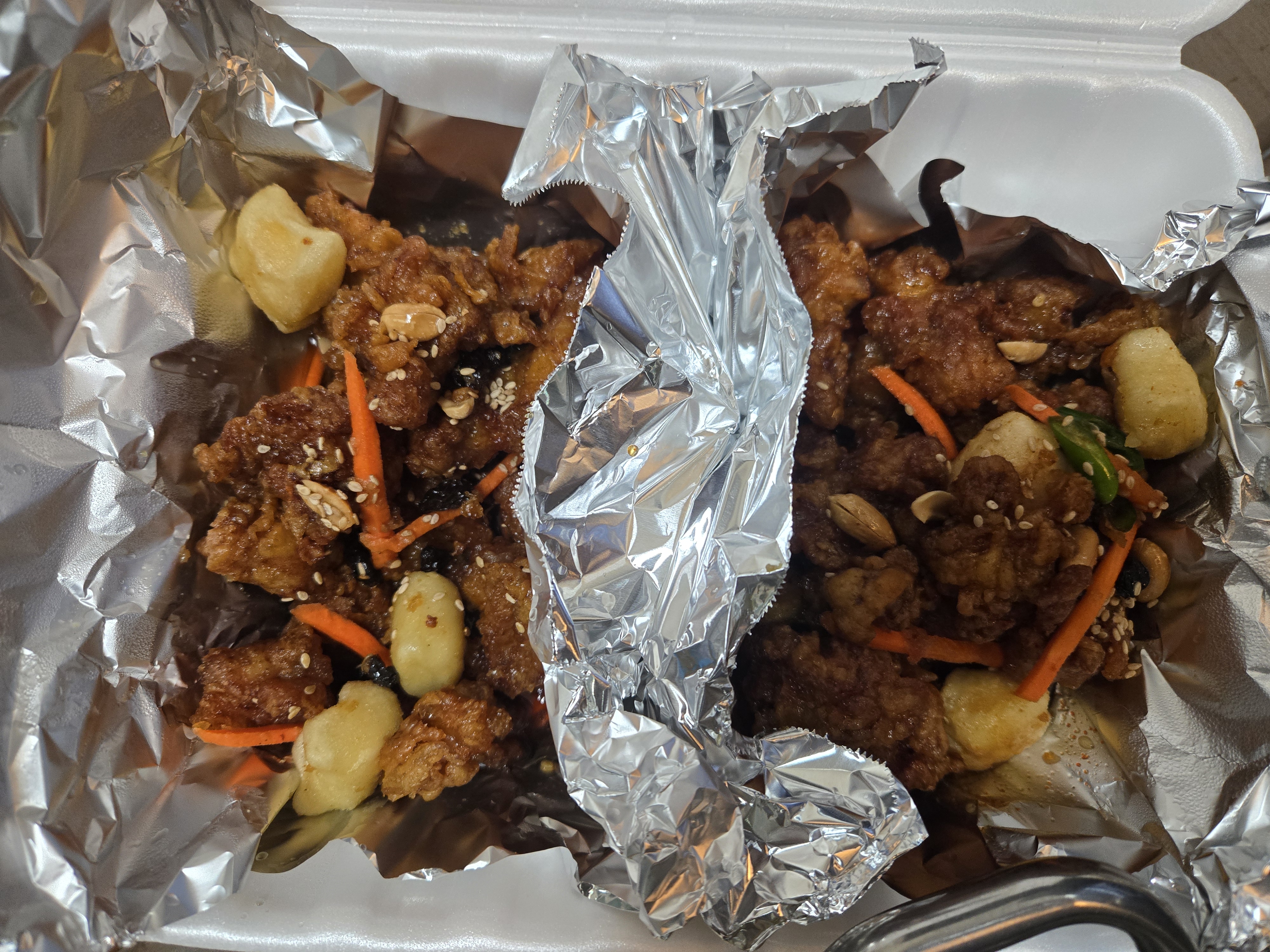 순살은 다리살 위주로 구성된 느낌이라 퍽퍽한 살은 거의 없었고, 전체적으로 촉촉했어요. 닭강정 위에는 땅콩 토핑이 올라가 있고, 떡도 함께 들어 있어요.