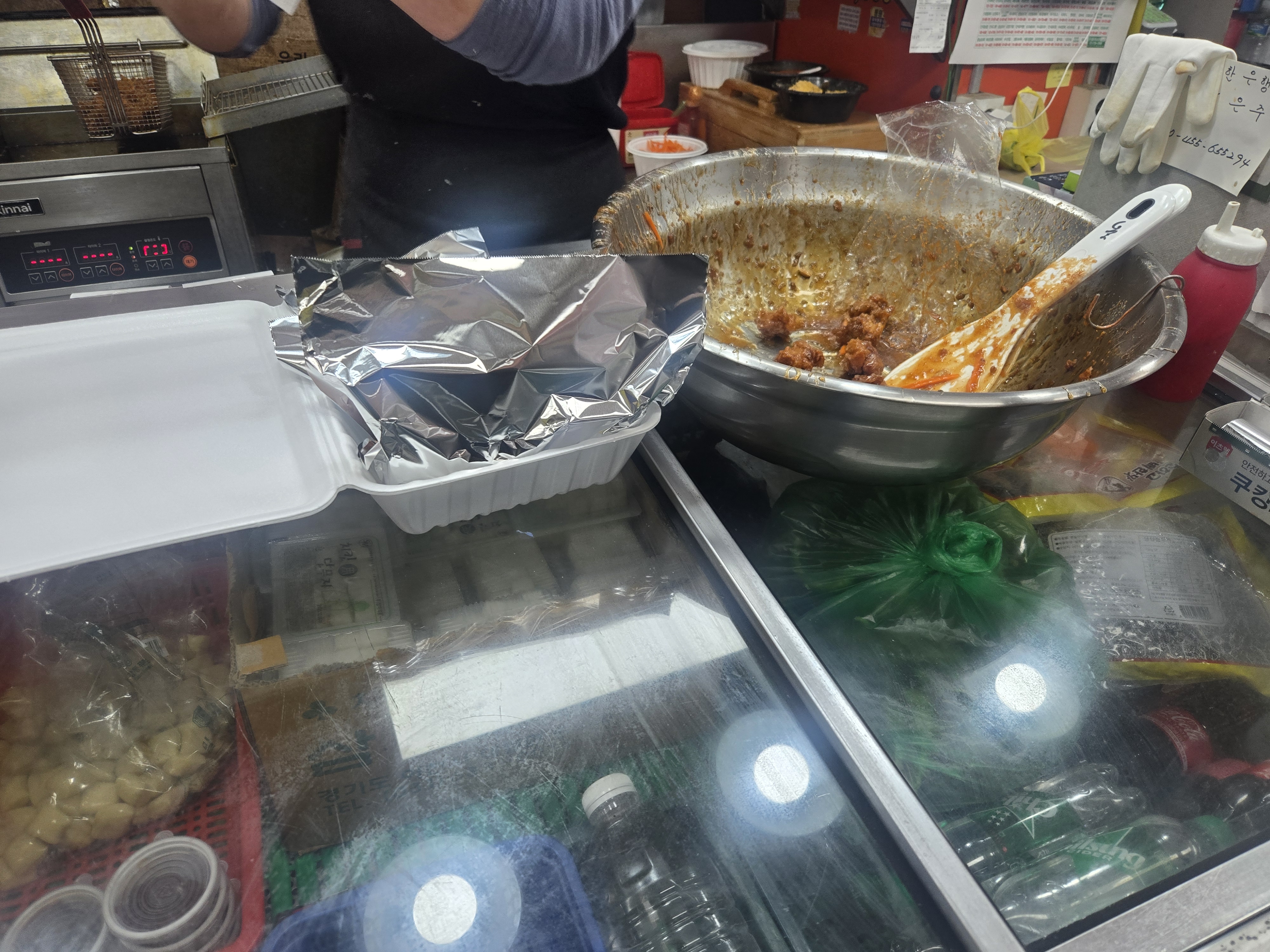 튀김기는 일반 튀김기를 사용하고 있었고, 기름 상태가 비교적 깨끗해 보여서 인상적이었어요. 주문하면 바로 튀긴 닭에 양념을 묻혀주는 방식입니다.