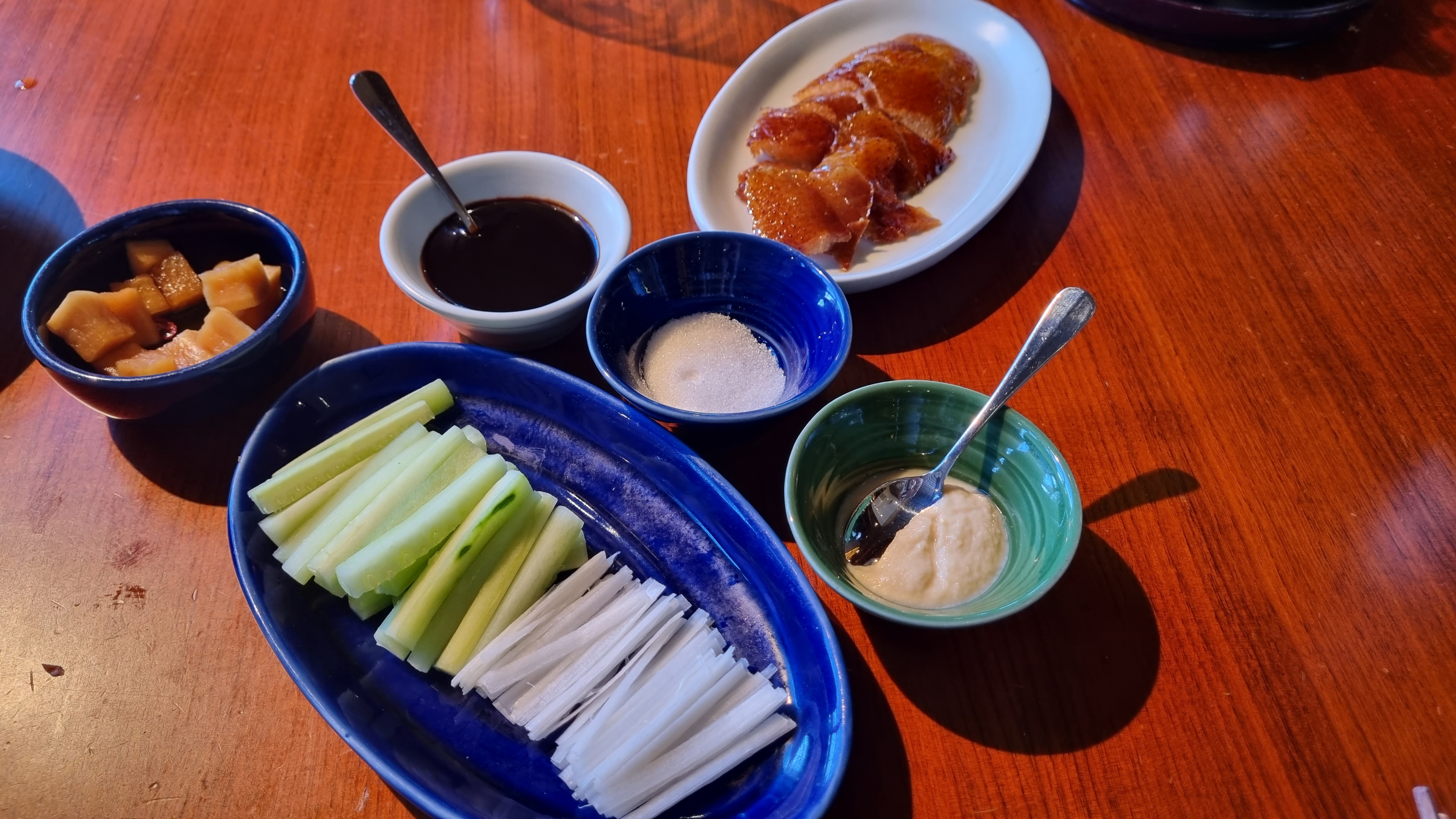 베이징 덕은 껍질만 담긴 접시, 껍질과 살이 함께 있는 접시, 살코기만 담긴 접시로 나눠져 나옵니다.