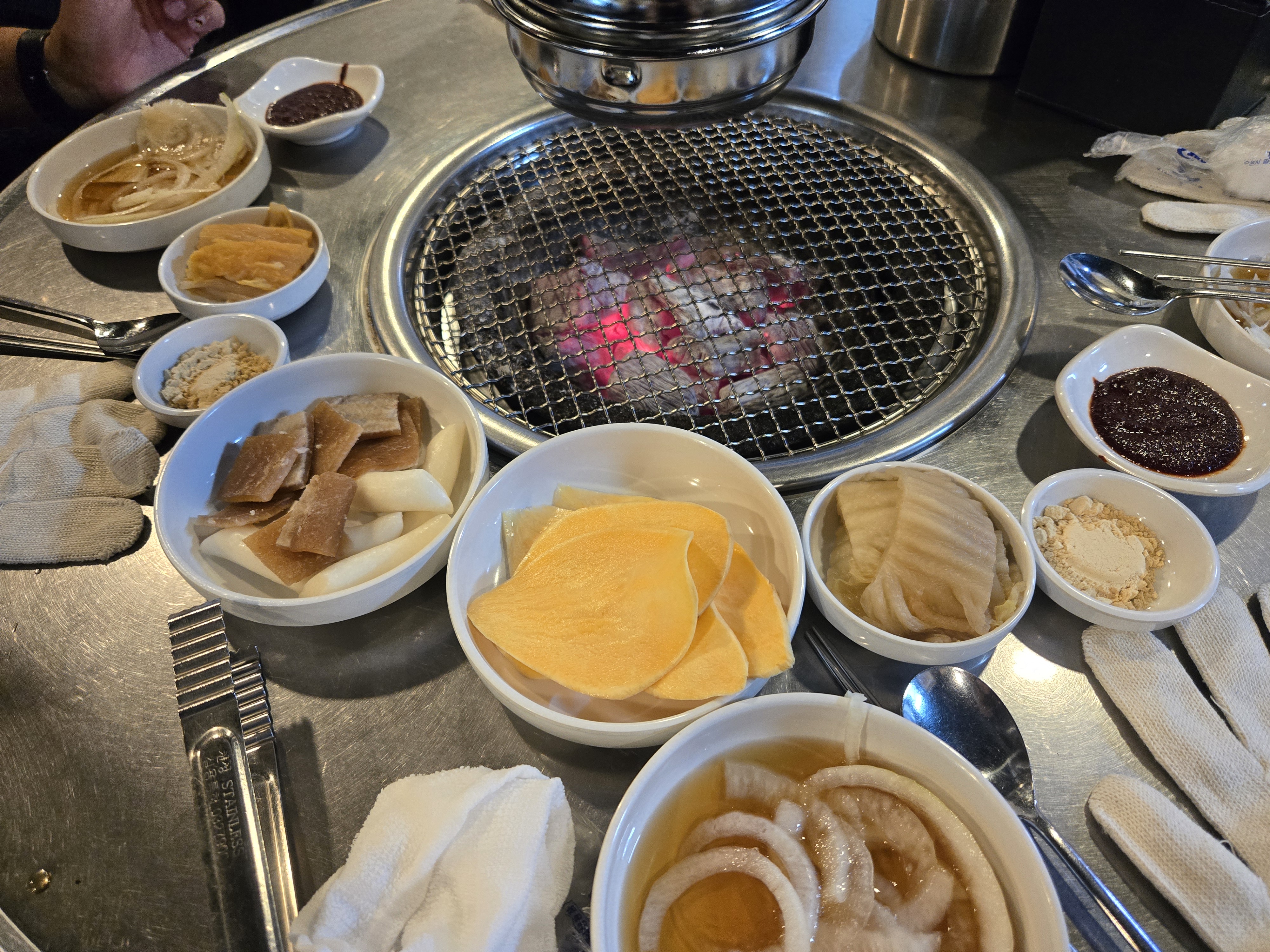 테이블에는 주전부리로 떡, 고구마, 돼지껍데기를 숯불에 구워 먹을 수 있도록 준비되어 있고,