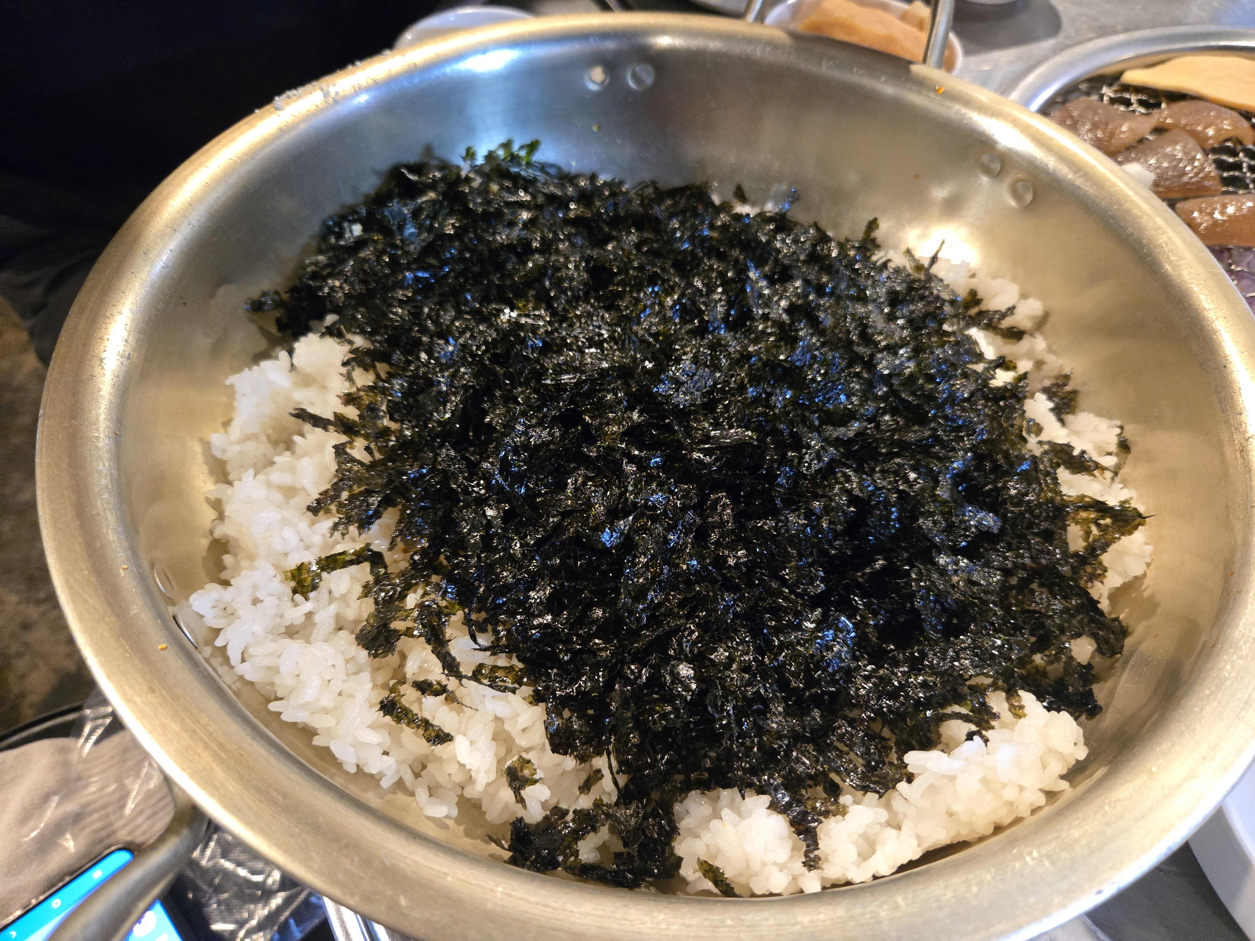 비벼서 김에 싸 먹는 방식인데, 양념 쪽갈비와 정말 잘 어울립니다.